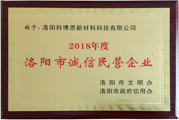 近日,由市文明辦與市政府信用辦舉辦的《洛陽市2018年度“誠信經(jīng)營企業(yè)”和“誠信建設(shè)先進(jìn)個人”評選活動》,經(jīng)推薦遴選和嚴(yán)格評審,洛陽科博思新材料科技有限公司被授予“誠信民營企業(yè)”榮譽稱號。