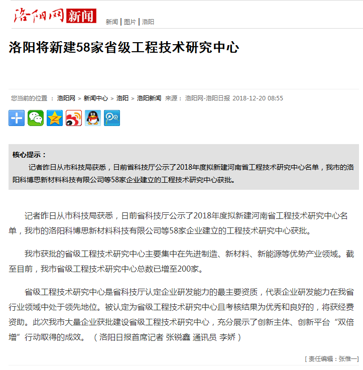 日前,省科技局公示2018年度擬建河南省工程技術(shù)中心名單,洛陽科博思新材料科技有限公司榜上有名。省級工程技術(shù)研究中心是省科技廳認(rèn)定企業(yè)研發(fā)能力的最主要資質(zhì),代表企業(yè)研發(fā)能力在我省行業(yè)領(lǐng)域中處于領(lǐng)先地位??撇┧即舜潍@批省級工程技術(shù)研究中心,是省科技廳對科博思科研實(shí)力和科研平臺(tái)的肯定。
