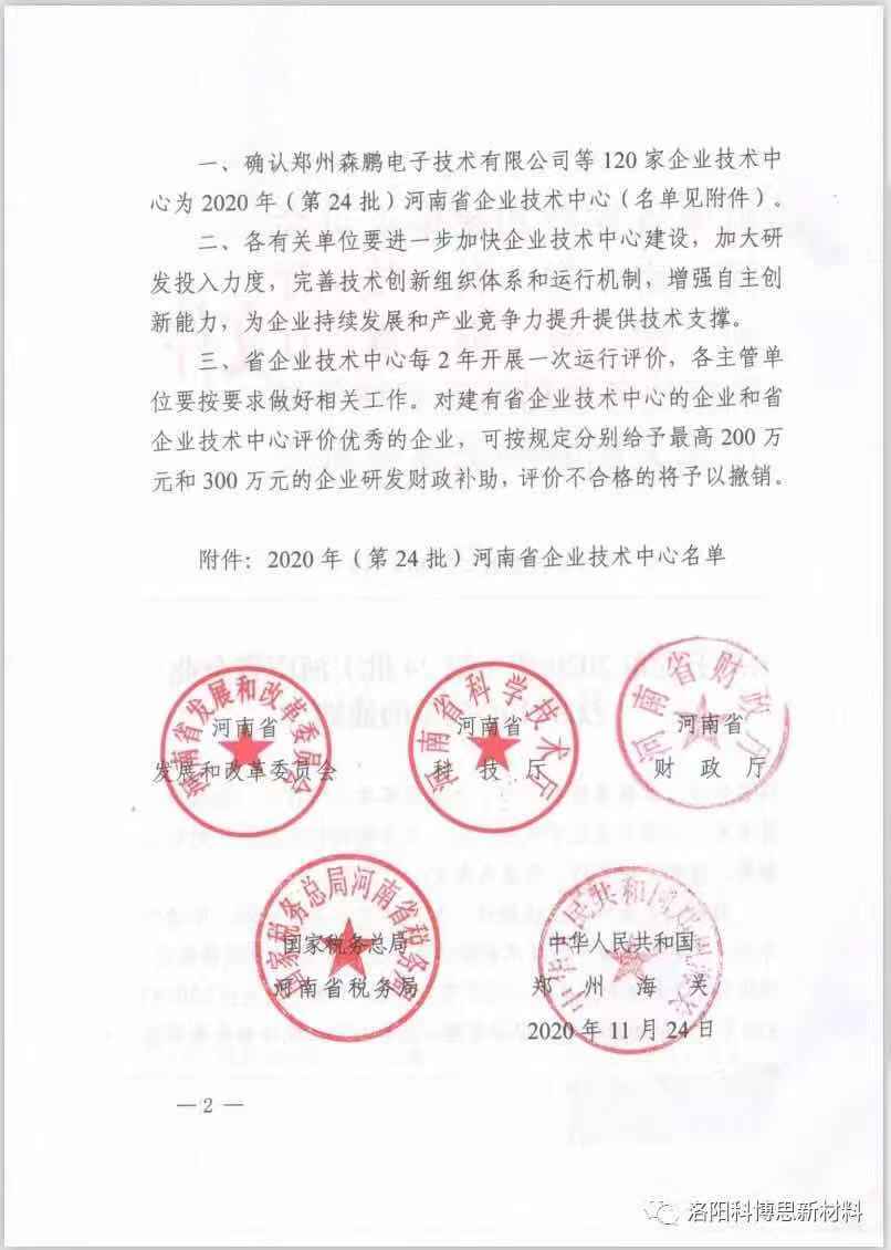 近日,河南省發(fā)展和改革委員會(huì)下發(fā)了《關(guān)于發(fā)布2020年(第24批)河南省企業(yè)技術(shù)中心名單的通知》(豫發(fā)改高技〔2020〕919號(hào)),經(jīng)過評(píng)審、考察、公示等環(huán)節(jié),洛陽(yáng)科博思新材料科技有限公司從全省多家企業(yè)脫穎而出,順利通過第24批省級(jí)企業(yè)技術(shù)中心認(rèn)定,這是公司在2018年被認(rèn)定為洛陽(yáng)市企業(yè)技術(shù)中心后的又一突破。