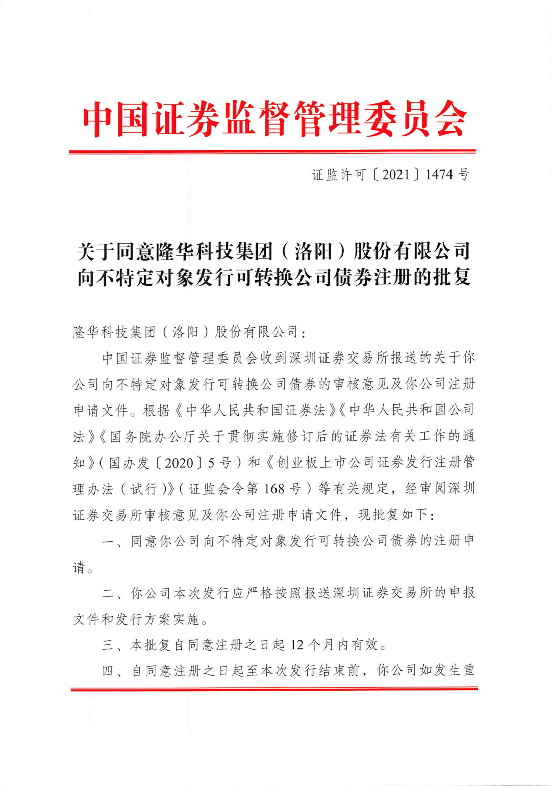 近日,隆華科技收到中國證券監(jiān)督管理委員會出具的《關(guān)于同意隆華科技集團(洛陽)股份有限公司向不特定對象發(fā)行可轉(zhuǎn)換公司債券注冊的批復(fù)》(證監(jiān)許可〔2021〕1474號)。