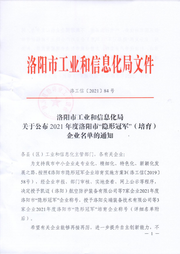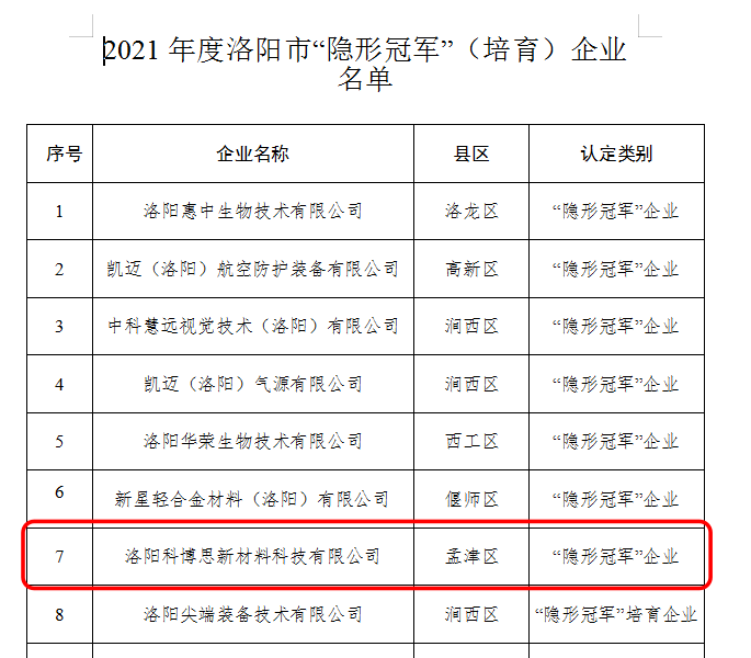 近日,洛陽(yáng)市工業(yè)和信息化局印發(fā)了《關(guān)于公布2021年度洛陽(yáng)市“隱形冠軍”(培育)企業(yè)名單的通知》(【2021】84號(hào)),洛陽(yáng)科博思新材料科技有限公司榮獲“隱形冠軍”企業(yè)稱號(hào)。